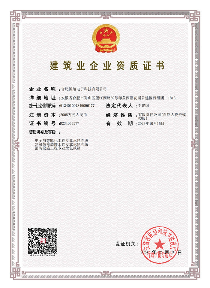公司現已獲得承裝(修、試)電力設施許可證、電子與智能化工程專業承包壹級資質、建筑裝修裝飾工程專業承包壹級資質、消防設施工程專業承包貳級、安全技術防范行業壹級資質、雷電防護裝置檢測資質證乙級資質、安全生產許可證、通過ISO9001:2015質量管理體系認證、ISO14001:2015環境管理體系認證、OHSAS18001:2007職業健康安全管理體系認證等榮譽。我們還將進一步努力,爭取贏得更多的榮譽。