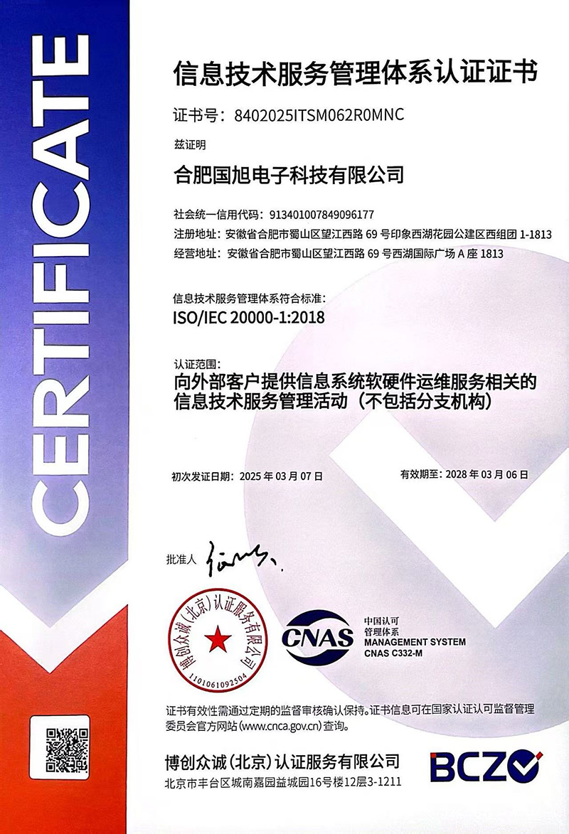 合肥國旭電子科技有限公司創立于2006年,總注冊資本2008萬。公司總部地址位于安徽IT主流商圈核心,合肥市蜀山區望江西路與肥西路交口西湖國際廣場。 公司是專業從事智能防雷檢測系統、智能化工程設計與施工工程、防雷設計施工工程、數據中心機房、消防工程、網絡監控安全技術防范工程、及智能變電站安全預警系統。